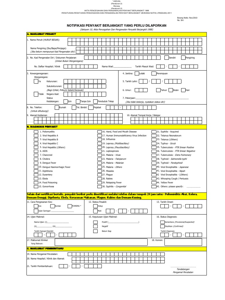 Borang Notifikasi Penyakit Berjangkit Yang Perlu Dilaporkan