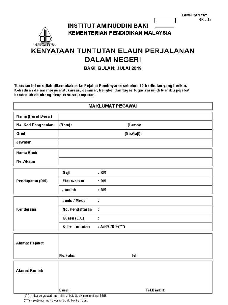 Borang Tuntutan Perjalanan Dalam Negeri 2018