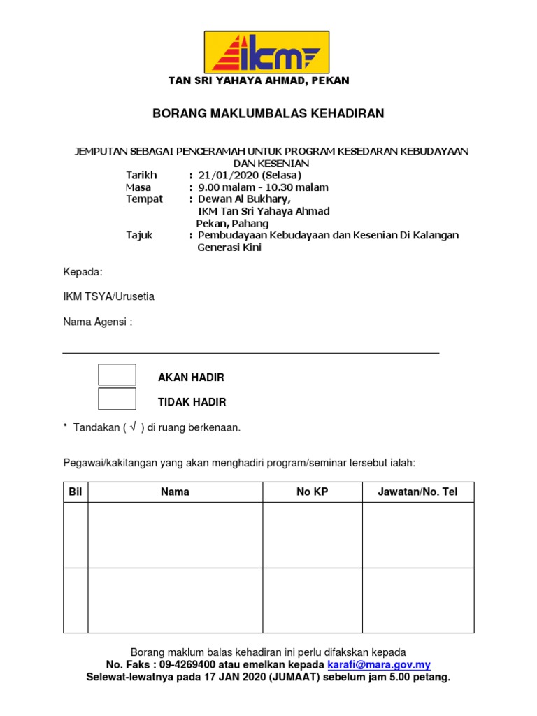 Borang Maklum Balas Kehadiran Ibu Bapa