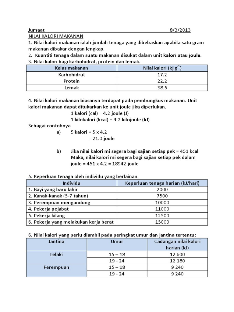 Jadi untuk menurunkan berat badan perkiraan total kalori yang diperlukan wanita adalah 1200 1500 kalori manakala lelaki adalah 1500 1800 kalori sehari. Kuih lapis sekeping 130 kalori 3. Satu kalori bersamaan dengan 4 184 joules. Sebagai contoh sebiji epal mempunyai nilai 80 kalori sumber tenaga manakala berjalan kaki sejauh 1 batu menggunakan tenaga sebanyak 100 kalori kalori yang dibakar untuk menghasilkan tenaga.