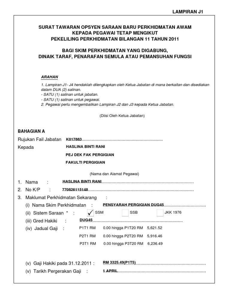 Lampiran J1 Surat Tawaran Opsyen Saraan Baru Perkhidmatan Awam Kepada Pegawai Tetap Mengikut Pekeliling Perkhidmatan Bilangan